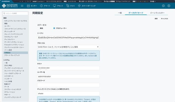 下流のGuardianはログやアラートデータをファイルとして、一旦、データダイオード側に送る構成となります。このときに選択できるプロトコルは、FTP、SSH/SCP、SMBの中から選択できます。以下の例は、Guardianから、SMBを使用してデータダイオードの参照する共有フォルダー(フォルダー名:share)にデータを送信する設定です。
