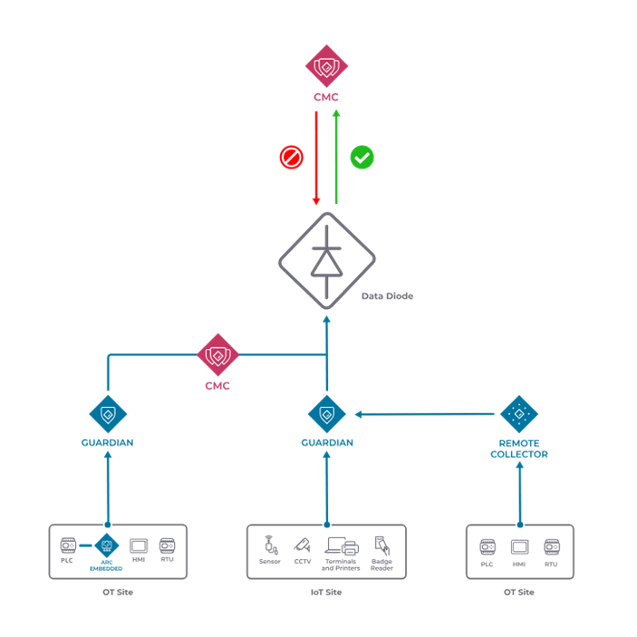 以下は構成図です。データダイオードは物理的に一方向にしかデータを転送できませんので、物理層レベルでネットワークの分離が可能です。NOZOMI製品には、データダイオード越しに下流のCMCやGuardianから上流のCMCへログやアラートデータを送信する機能が実装されています。