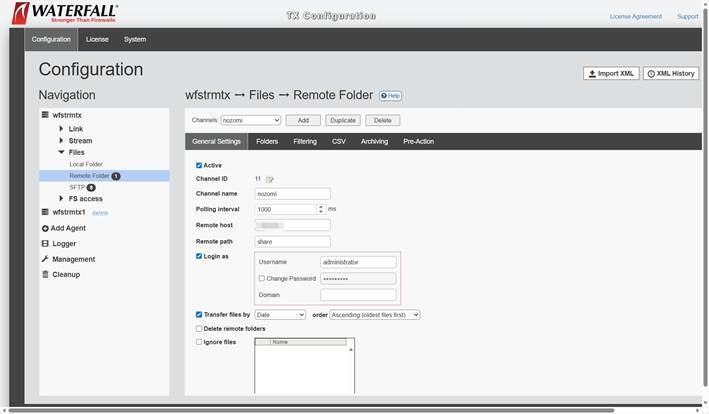 下流のGuardianやCMCからデータを受け取ったデータダイオードは、ファイルを一方向通信に変換して上流側へ送信します。以下の例は、下流側のデータダイオード(WATERFALL TXHOST)が共有フォルダーからSMBでファイルを取得して、上流側に転送する設定です。